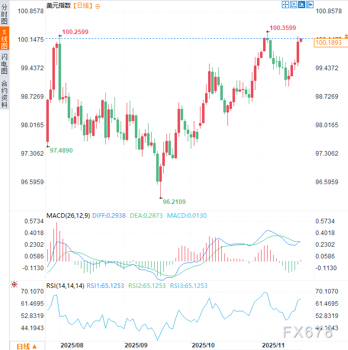 美元/日元的走强不仅源于日元的疲软,更得益于近期政策声明与美联储会议纪要强化了市场对美元的信心。周四美元指数已连续第五个交易日上涨,涨幅约0.06%,现交投于100.18附近,始终稳守100点关键位上方,反映出投资者对美元重拾信心——这种信心源自对利率持续高位的预期,预示着中期内美元需求将保持稳定。